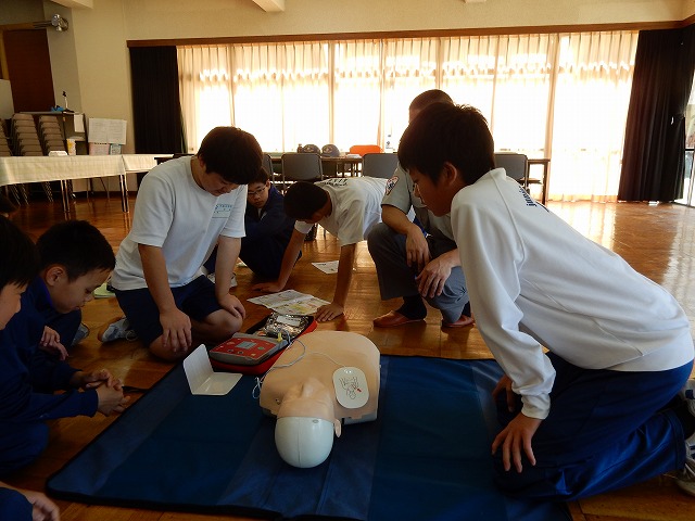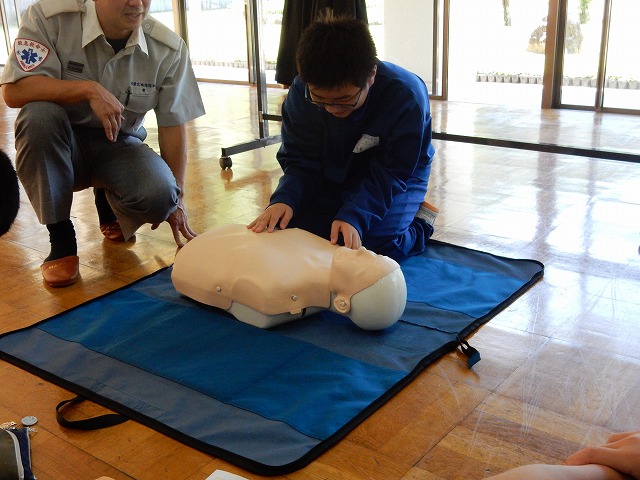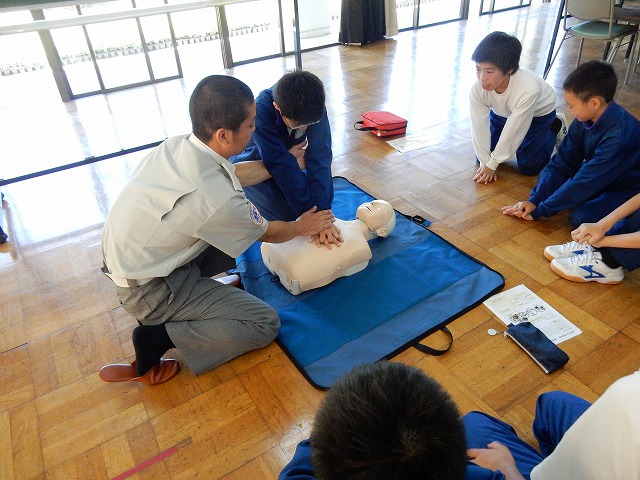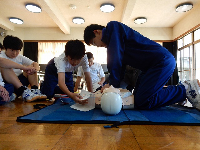 7月1日(金)、保健体育の授業で2年生が救急法を学びました。木曽消防署北分署の方に心肺蘇生法、AEDの使用方法などを教えていただきました。