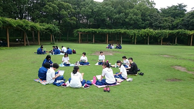 新日鉄の見学を終え、大池公園に移動して昼食です。ピクニックみたいです。