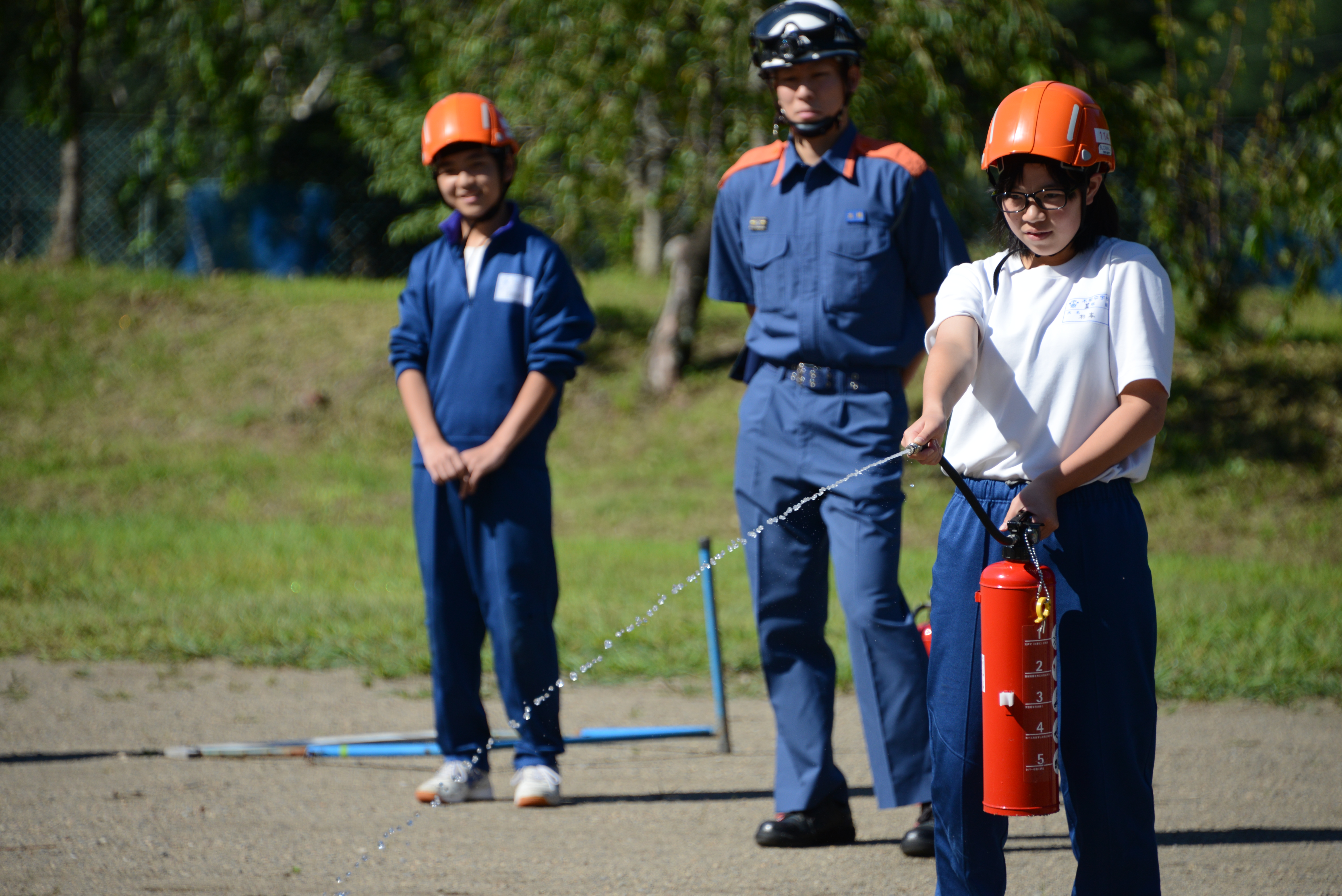 避難後の体験訓練は、今回は消火訓練でした。消火器を確実に操作する魔法の合い言葉「ピ(ピンを抜く)・ノ(ノズルの先端を持ち、炎に向ける)・キ(距離を詰める)・オ(押す)」を教わりました。
